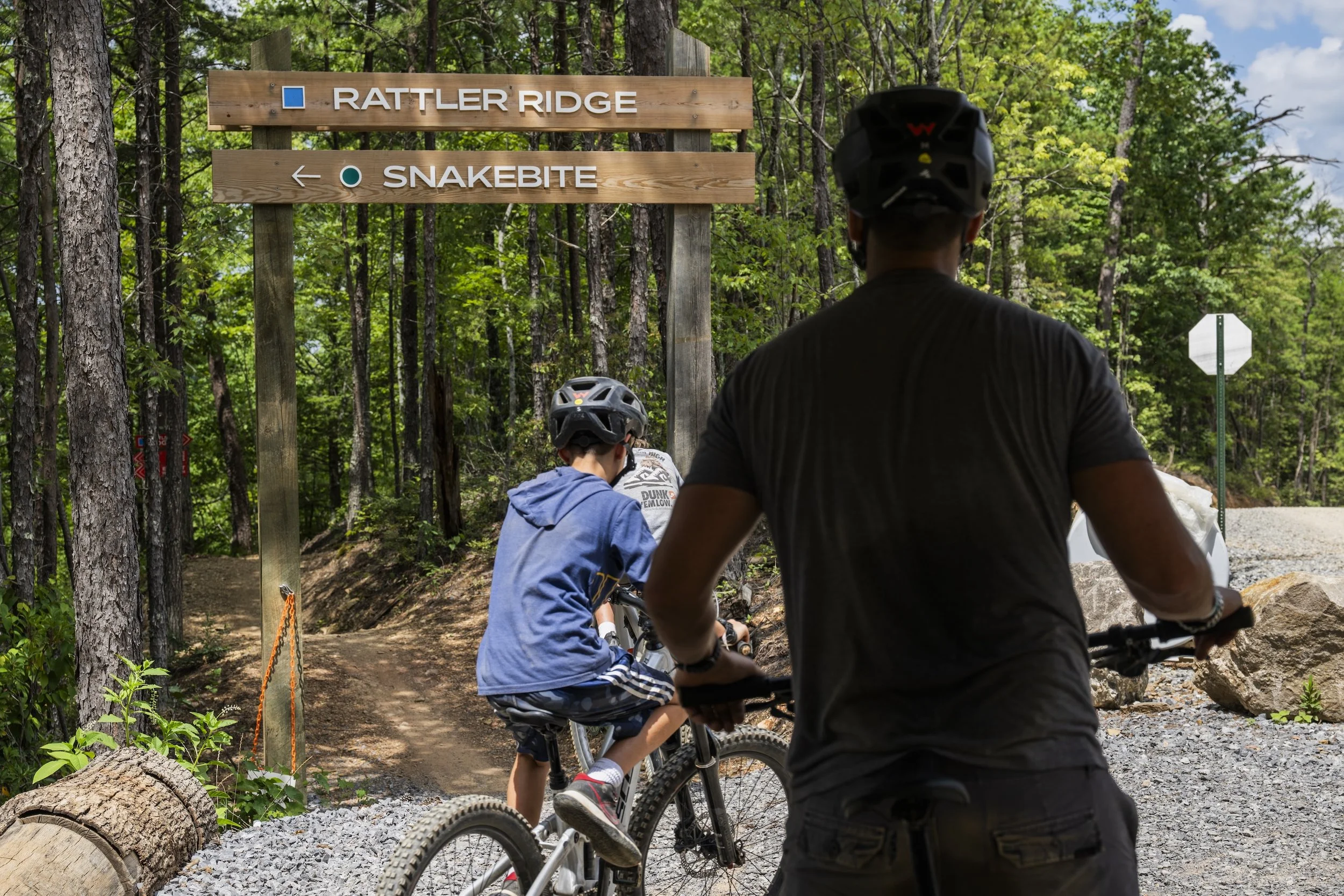 Thrill-seekers first encounter an archway for whichever adventure they choose. Along the bike trails, there are various common safety signage, such as “Stop” “Merge”and “Crossing”
